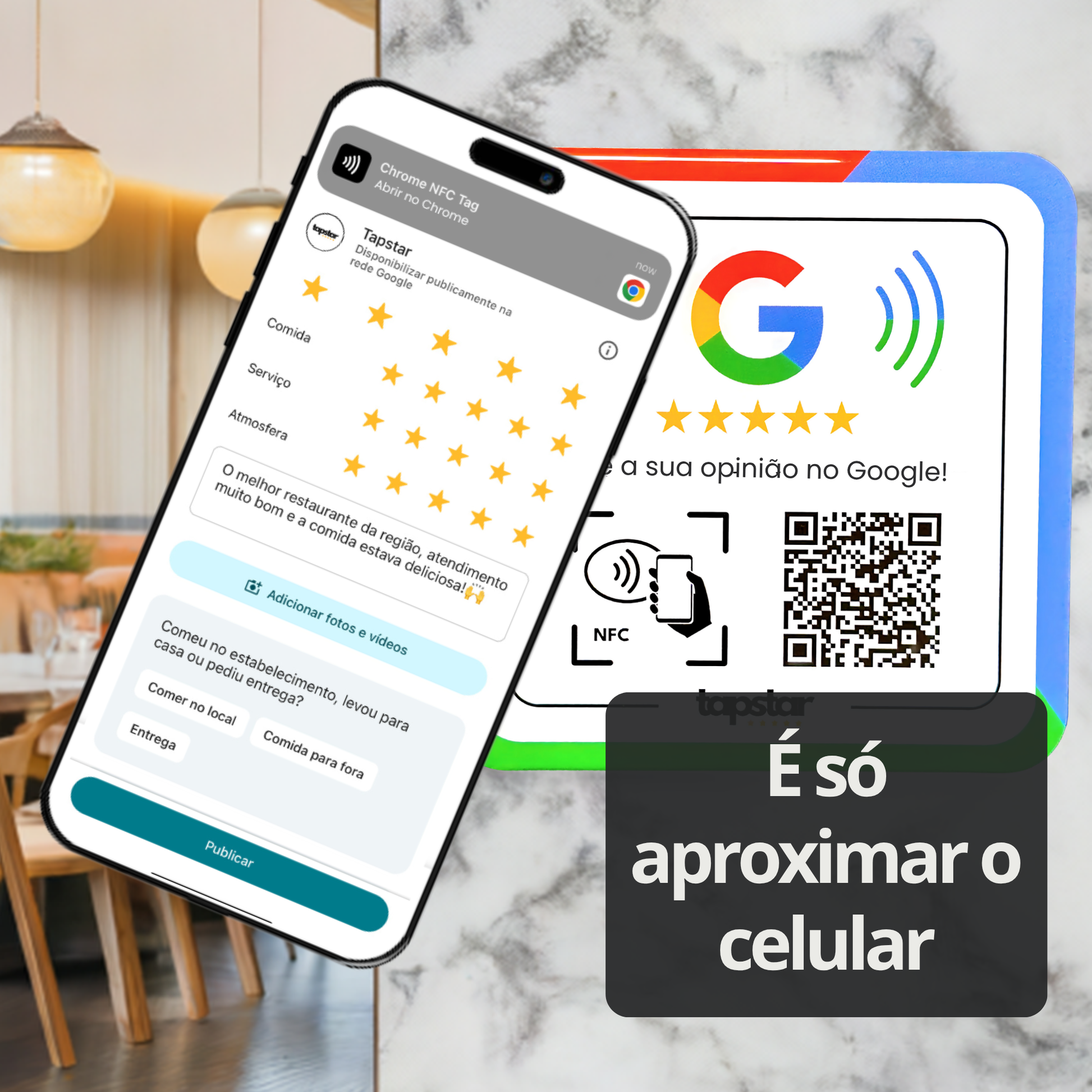 Significa tecnologia sem contacto. Os dispositivos Tapstar têm incorporado um chip NFC que deteta o telemóvel do cliente e direciona-o diretamente para deixar uma avaliação no Google.