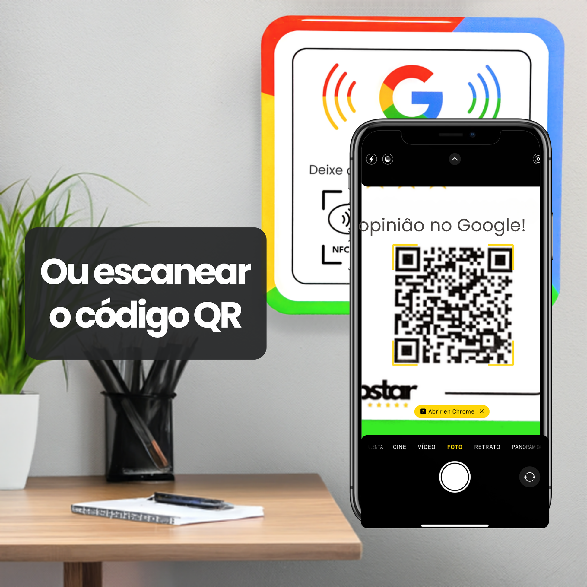 Conectado às avaliações no Google do teu negócio, permite que os teus clientes deixem a sua avaliação de 5 estrelas ao aproximar o telemóvel ou ao ler o código QR.